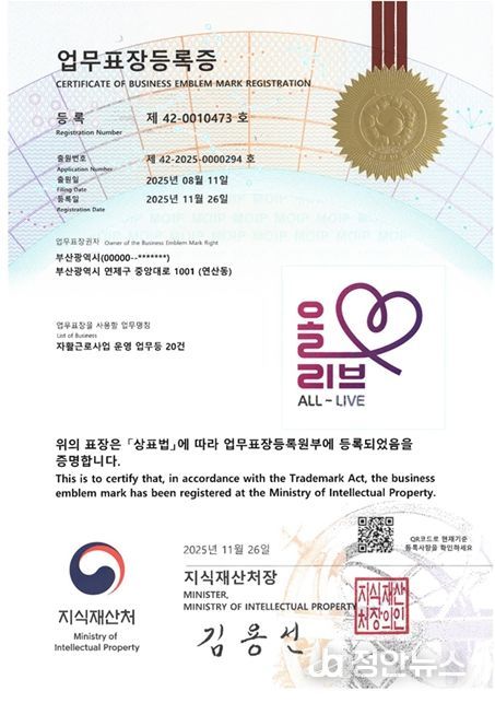 정안뉴스 황정혜 기자 | 부산시는 지자체 최초로 시 대표 자활정책 브랜드인 '올리브(ALL-LIVE)'를 특허청에 상표로 등록했다고 밝혔다.