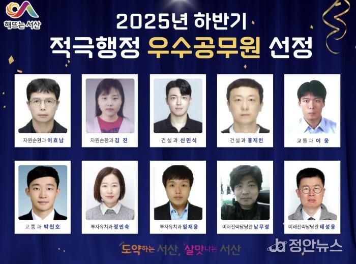 정안뉴스 황도연 기자 | 충남 서산시는 2025년 하반기 적극행정 우수사례 5건과 이를 추진한 우수공무원 10명을 선정했다고 밝혔다.