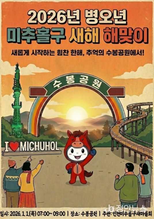 정안뉴스 안정주 기자 | 인천 미추홀구새마을회는 오는 2026년 1월 1일 오전 7시부터 9시까지 수봉공원에서 ‘2026 병오년(丙午年) 새해 해맞이 행사’를 개최한다.