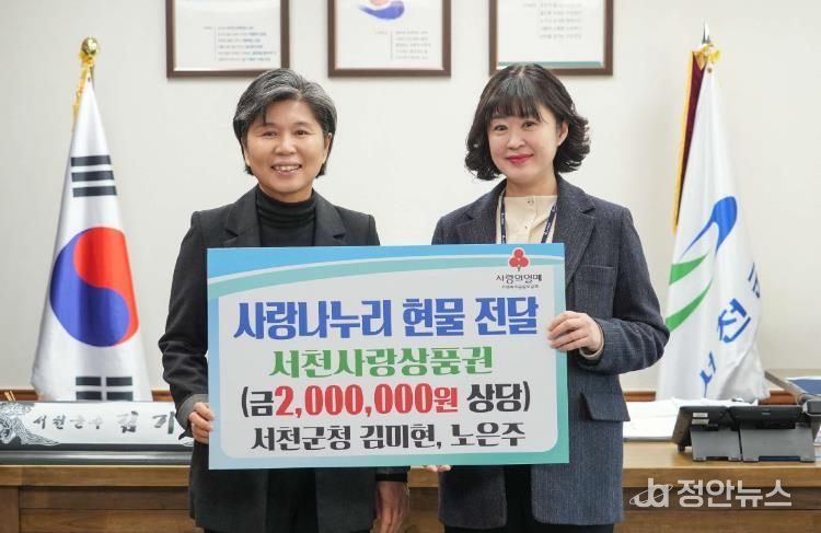 정안뉴스 황도연 기자 | 서천군청 자치행정과 노은주 행정인사팀장과 인구정책과 김미현 노인복지팀장이 최근 한 시상식에서 받은 상금 전액을 사랑나누리 현물로 기탁하며 연말 이웃사랑 실천에 동참했다.