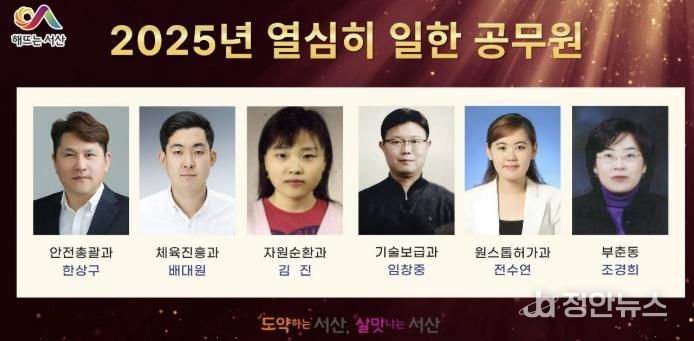 정안뉴스 황도연 기자 | 충남 서산시는 올해 시정 발전과 시민 삶의 질 향상을 위해 노력한 공무원 6명을 ‘열심히 일한 공무원’으로 선정했다고 밝혔다.