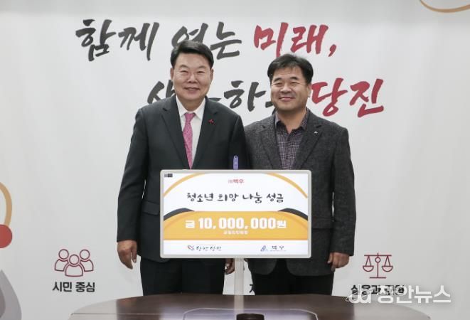 정안뉴스 황도연 기자 | ㈜벽우는 지난 30일 오후 당진시청 7층 접견실에서 지역 내 어려운 이웃을 돕기 위한 성금 1000만 원을 당진시에 기탁했다.