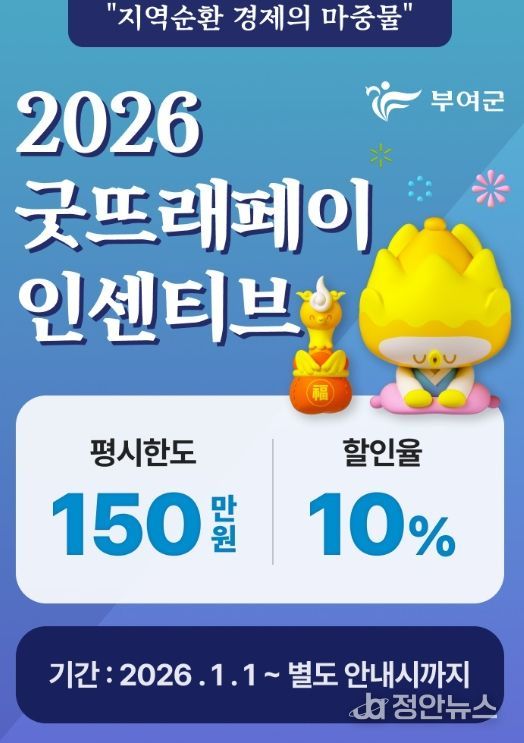 정안뉴스 황도연 기자 | 부여군은 지역경제 활성화와 군민 혜택 지원을 위해 2026년 1월부터 굿뜨래페이 평시 한도를 월 150만 원, 충전 인센티브를 10%로 운영한다고 밝혔다.