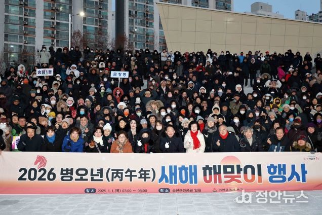 정안뉴스 안정주 기자 | 인천 동구는 1일 송현근린공원에서 각 동 주민자치회·자생단체 회원 등 다수의 구민이 참여한 ‘2026년 병오년 새해 맞이’행사를 개최했다고 밝혔다.