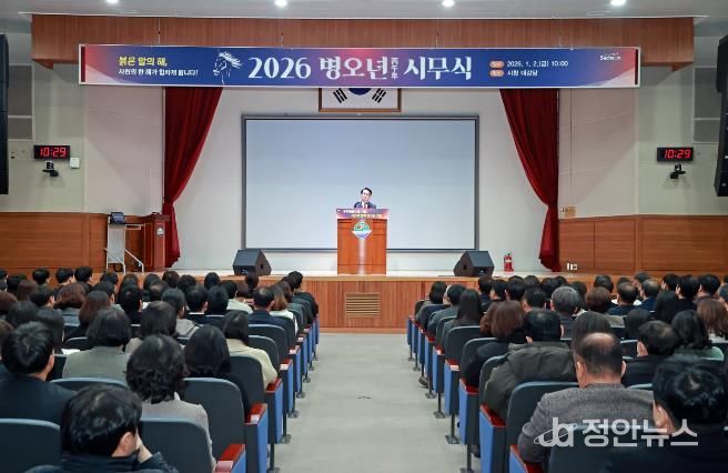 정안뉴스 김재홍 기자 | 사천시는 2일 오전 10시 시청 대강당에서 박동식 사천시장을 비롯해 김제홍 부시장, 국·소장 및 전 직원이 참석한 가운데 2026년 병오년 시무식을 개최했다.