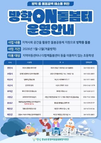 정안뉴스 황도연 기자 | 충남사회서비스원은 1월 2일부터 겨울방학 기간 동안 돌봄이 필요한 아동을 위해 방학ON돌봄터를 발굴하여 운영을 지원한다.