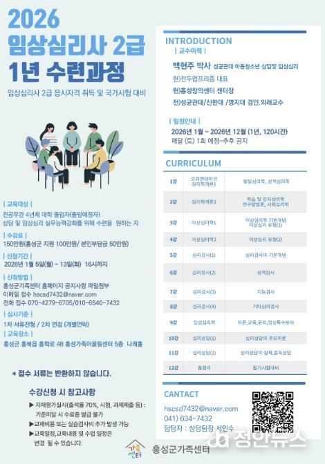 정안뉴스 황도연 기자 | 홍성군은 아동의 심리적 건강을 증진하기 위한 아동 심리상담 전문가 양성 과정 수련생을 모집한다.