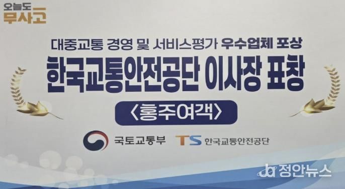 군에 따르면 지난달 19일 국토교통부와 한국교통안전공단 주관으로 서울 그랜드힐 컨벤션에서 열린 ‘대중교통 경영 및 서비스평가 및 시책평가 우수기관 시상식’에서 홍주여객은 교통안전공단 이사장 표창을 수상했다.