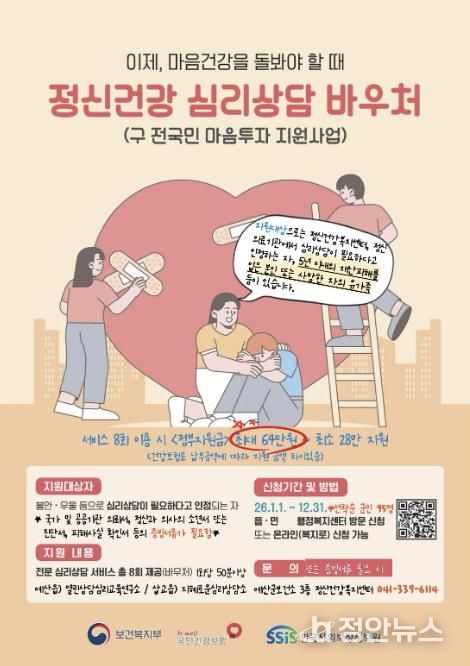 정안뉴스 황도연 기자 | 예산군보건소 정신건강복지센터는 우울·불안 등 정서적 어려움을 겪는 군민의 마음건강 돌봄과 정신질환 조기 발견, 자살 예방을 위해 ‘정신건강 심리상담 바우처사업’을 추진하고 있다.