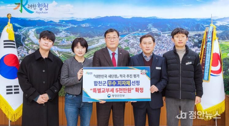 정안뉴스 김재홍 기자 | 합천군은 행정안전부가 주관한 ‘대한민국 새단장’ 평가에서 우수 지자체로 선정돼 특별교부세 5천만 원을 확보했다고 6일 밝혔다.