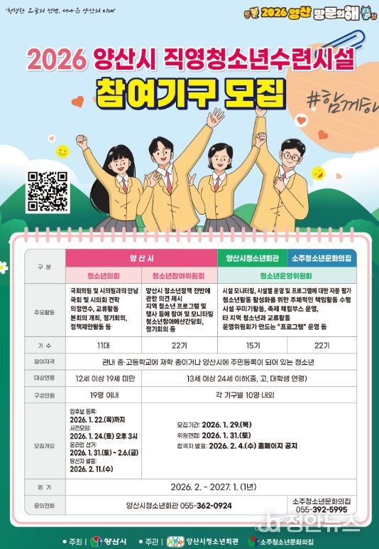 신청방법은 접속하여 네이버 폼 양식을 제출하여 신청하면 된다. 2026 양산시 직영 청소년수련시설 청소년참여기구는 양산시가 주최하며, 양산시청소년회관과 소주청소년문화의집 주관으로 진행된다.