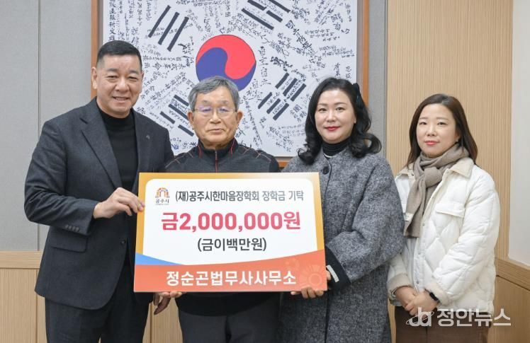 정안뉴스 황도연 기자 | 정순곤법무사사무소는 지난 6일 (재)공주시한마음장학회에 가정형편이 어려운 학생들을 위한 장학금 200만 원을 기탁했다.