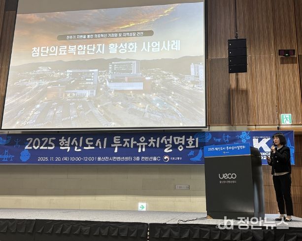 재단은 지난해 11월 울산전시컨벤션센터에서 열린 ‘2025 혁신도시 투자유치설명회’에서 혁신도시 투자유치 및 기업지원 우수사례 기관으로 선정됐으며 박은희 부장이 ‘첨단의료복합단지 활성화 사업사례’를 주제로 발표했다.