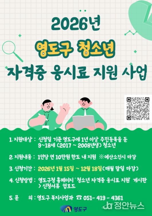 정안뉴스 황정혜 기자 | 부산시 영도구는 청소년의 자기계발과 미래 역량 강화를 지원하기 위해 ‘2026년 영도구 청소년 자격증 응시료 지원사업’을 시행한다.