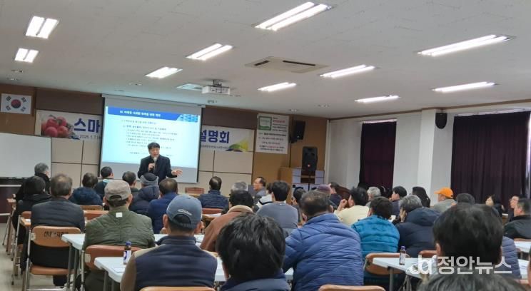 정안뉴스 김재홍 기자 | 밀양시는 지난 7일 산내면 얼음골사과발전협의회 대강당에서 사과 재배 농업인을 대상으로 ‘미래형 사과과원 조성을 위한 설명회’를 개최했다.
