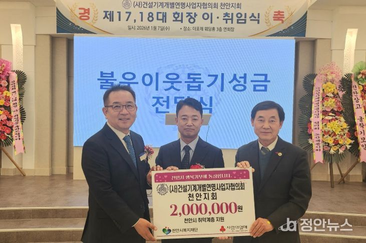 정안뉴스 황도연 기자 | (재)천안시복지재단은 ㈔건설기계개별연명사업자협의회 천안지회가 취약계층을 위한 후원금 200만 원을 기탁했다고 8일 밝혔다.