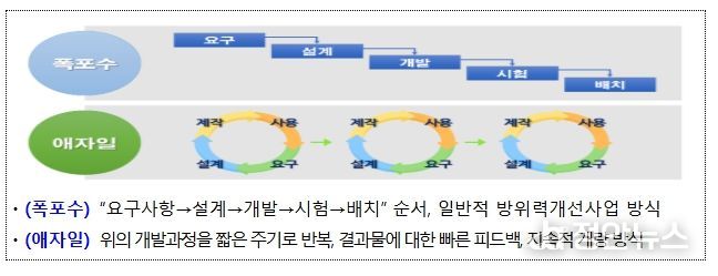 애자일(Agile) 개발은 짧은 주기로 소프트웨어를 반복 개발·배포하고 전력화 이후에도 성능을 지속 고도화할 수 있는 방식으로, 미국 국방부와 정보통신기업에서도 널리 활용되고 있다. 기존 폭포수(Waterfall) 방식은 장기간 일괄 개발 구조로 하드웨어 중심 무기체계 개발에 기여해왔으나, 인공지능(AI), 무인·로봇 등 소프트웨어 중심 첨단 무기체계의 신속하고 유연한 개발을 위해 애자일 방식을 새롭게 도입하게 됐다.