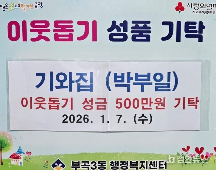 정안뉴스 황정혜 기자 | 부산시 금정구 부곡3동은 지난 7일 오륜동 기와집에서 어려운 이웃을 위해 성금 500만원을 기탁했다고 밝혔다.