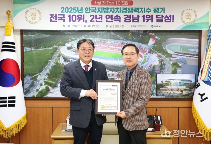 정안뉴스 김재홍 기자 | 지난해 전국에서 열 번째, 경남에서 가장 경쟁력이 높은 도시로 조사된 김해시가 8일 평가 주관기관인 (사)한국공공자치연구원으로부터 공식 인증서를 전달받았다.