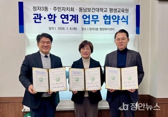 정안뉴스 안정주 기자 | 수원시 장안구 정자3동 행정복지센터와 주민자치회는 지역 내 협력 기반을 구축해 주민 맞춤형 프로그램을 확대하고자 지난 8일 동남보건대학교 평생교육원과 업무협약을 체결했다.