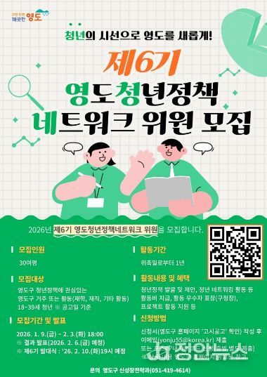 정안뉴스 황정혜 기자 | 부산 영도구는 지역 청년들의 목소리를 구정에 반영하고, 청년 스스로 정책 형성 과정에 참여할 수 있도록 ‘제6기 영도청년정책네트워크’ 위원을 1월 9일부터 2월 3일까지 공개 모집한다.