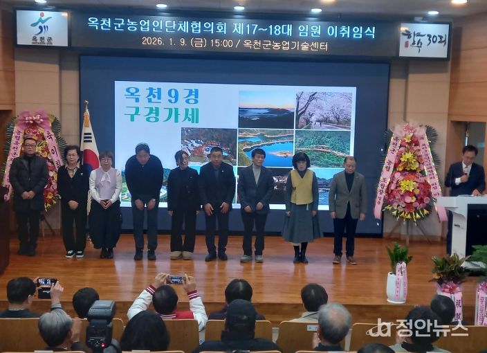 정안뉴스 황은경 기자 | 옥천군농업인단체협의회(회장 황동연)가 지난 9일 농업기술센터 농업인교육관에서 회원 및 내빈 100여명이 참여한 가운데 제17‧18대 회장 이‧취임식을 개최했다.
