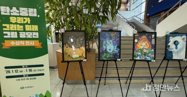 정안뉴스 김재홍 기자 | 창원특례시는 미래세대의 눈으로 바라본 기후적응과 회복 메시지를 시민과 공유하기 위해 ‘탄소중립, 우리가 그리는 미래’ 그림 공모전 수상작을 1월 12일부터 16일까지 시청 현관 1층 로비에서 전시한다고 밝혔다.