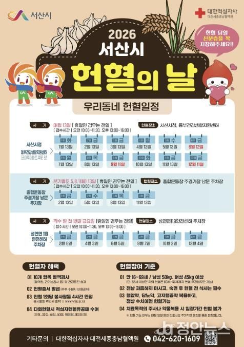 정안뉴스 황도연 기자 | 충남 서산시가 헌혈 기부 문화 정착과 안정적인 혈액 수급을 위해 ‘2026년 헌혈의 날’을 운영한다고 밝혔다.