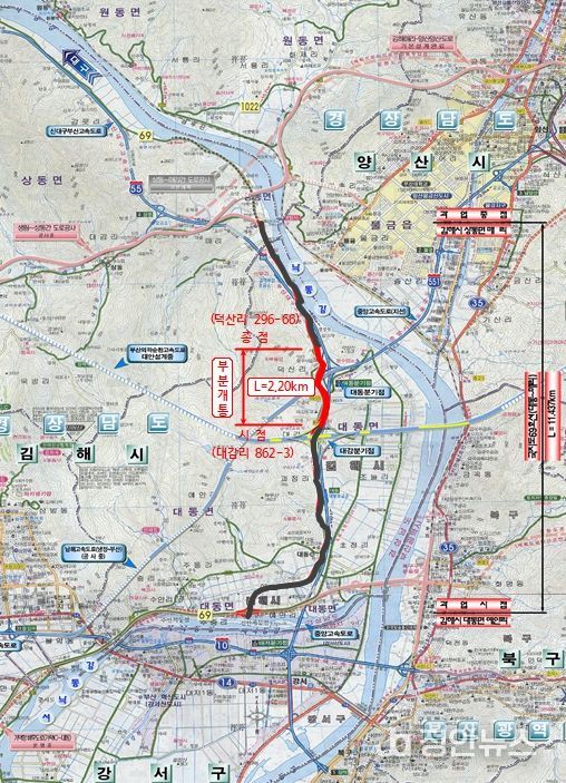 정안뉴스 김재홍 기자 | 김해시는 12일 오전 10시 국지도 69호선 일부구간(대동 감내교차로~신암교차로) 2.2km가 개통됐다고 밝혔다.