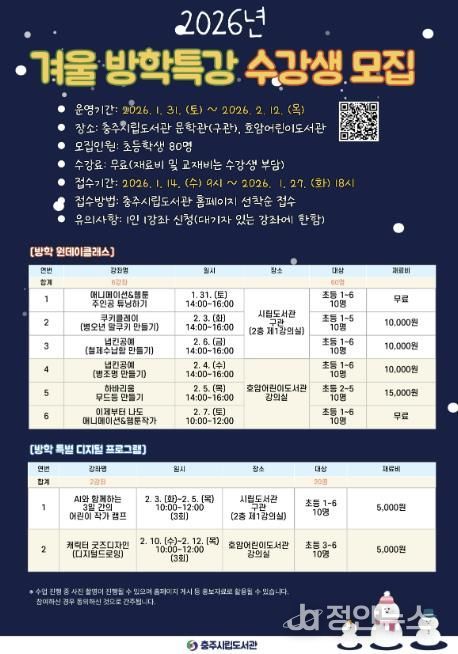 정안뉴스 황은경 기자 | 충주시립도서관은 겨울방학을 맞아 관내 초등학생을 대상으로 겨울 방학특강 수강생을 모집한다고 13일 밝혔다.
