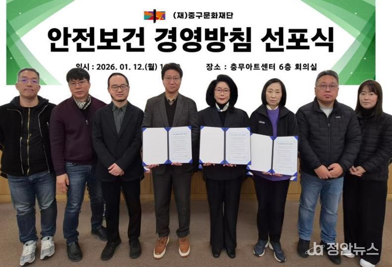 정안뉴스 안정주 기자 | 재단법인 중구문화재단이 지난 12일 충무아트센터 6층 회의실에서 ‘안전보건 경영방침 선포식’을 개최하고, 전 직원과 함께 안전한 근무환경 조성을 위한 경영 의지를 공유했다.