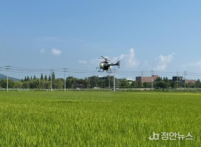 벼 병해충 공동방제 농작업 대행료 지원사업은 마을·들녘 단위 10ha내외의 구획화된 벼 재배단지를 대상으로 농약살포 무인헬기, 드론, 광역방제기, 붐스프레이어 등을 활용한 방제작업 대행료를 연 최대 3회까지 전액 지원한다.