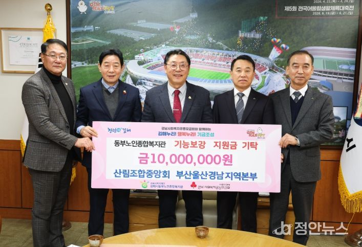 정안뉴스 김재홍 기자 | (재)김해시복지재단 김해시동부노인종합복지관(관장 심우영)에서는 지난 12일 산림조합중앙회 부산울산경남지역본부 시설보수 기능보강 지정기탁 금1,000만원 전달식을 개최했다.
