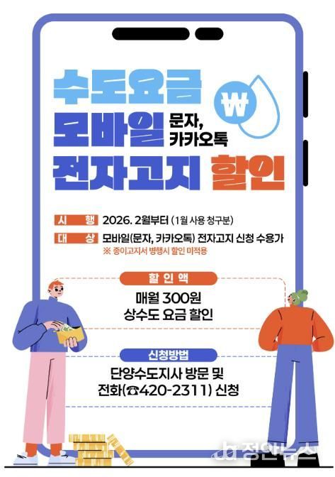 정안뉴스 황은경 기자 | 단양군은 종이 고지서 발송에 따른 행정비용과 환경 부담을 줄이고, 군민의 요금 납부 편의성을 높이기 위해 수도요금 모바일(문자·카카오톡) 전자고지 할인 제도를 오는 2월부터 시행한다고 밝혔다.