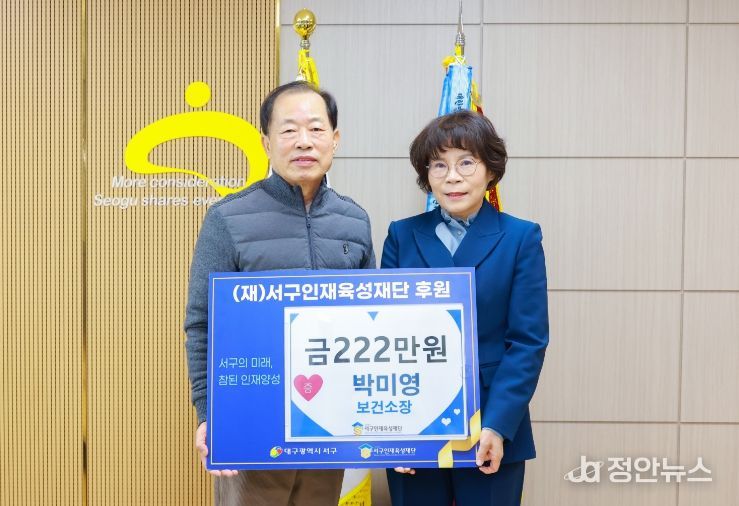 정안뉴스 안정주 기자 | 대구 서구청은 보건소 박미영 보건소장이 퇴임을 앞두고 지역 인재 육성을 위해 서구 인재육성재단에 222만 원을 기탁했다고 밝혔다.