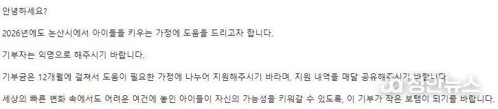 한편, 2020년 시작된 익명 기부자의 선행은 매년 논산시의 겨울을 녹이는 대표적인 미담으로 자리 잡았다. 시는 기부금 전달 과정에서 기부자의 익명성을 철저히 보장하면서도 그 따뜻한 영향력이 지역사회 전반으로 퍼져나갈 수 있도록 노력하고 있다.