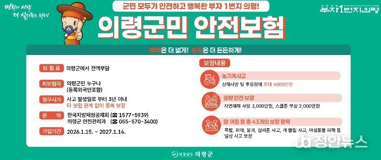 정안뉴스 김재홍 기자 | 의령군은 일상생활 중 예기치 못한 재난과 사고로부터 군민의 생활 안정을 지원하기 위해 ‘2026년 군민안전보험’에 갱신 가입하고, 1월 15일부터 본격 운영에 들어간다고 밝혔다.