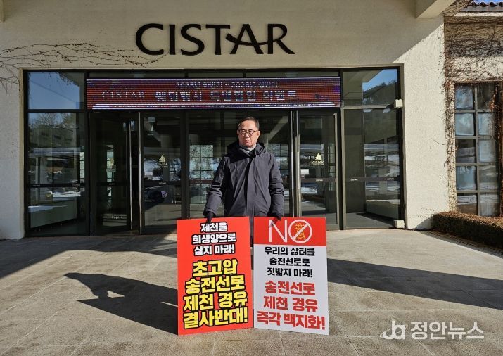 정안뉴스 황은경 기자 | 제천 신평창-신원주 송전선로 건설사업 반대추진위원회 신창준 위원장은 지난 14일 영월 동강시스타에서 열린 제5차 입지선정위원회 회의장 앞에서 1인 시위를 벌이고, 송전선로 건설계획 중단과 입지 선정 절차의 전면 재검토를 강력히 촉구했다.