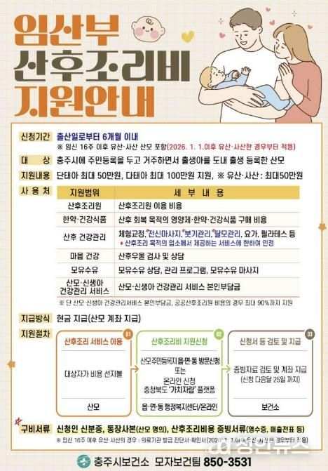 정안뉴스 황은경 기자 | 충주시는 출산과 양육에 대한 부담을 완화하고 산모의 신체적·정신적 회복을 지원하기 위해 산후조리비 지원 대상과 신청 방식을 확대한다고 15일 밝혔다.