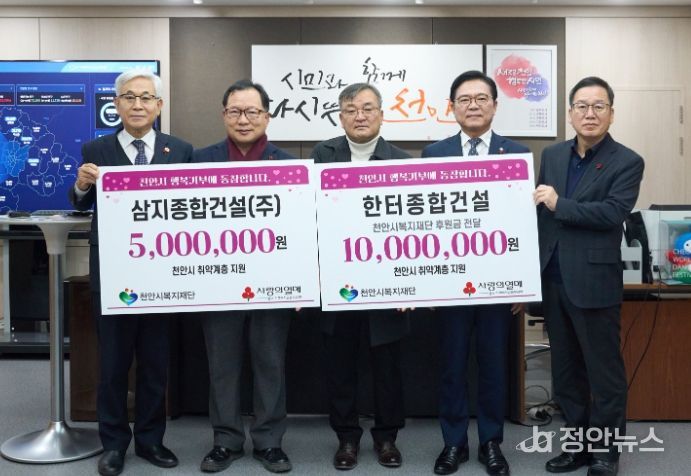 정안뉴스 황도연 기자 | (재)천안시복지재단은 15일 ㈜한터종합건설·삼지종합건설㈜이 취약계층을 위한 후원금 1,500만 원을 기탁했다고 밝혔다.