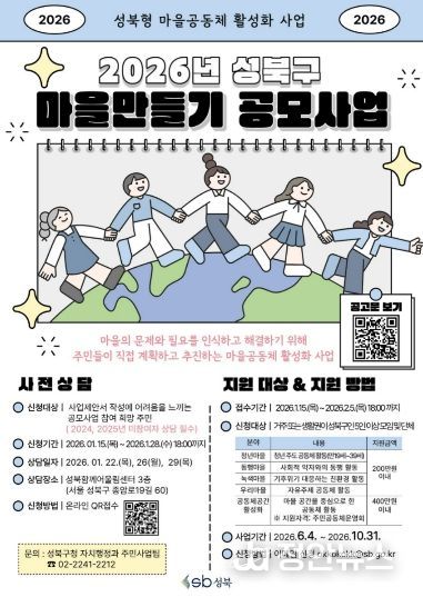 정안뉴스 안정주 기자 | 서울시 성북구는 마을공동체 활성화를 위해 '2026년 성북구 마을만들기 공모사업'을 진행한다.