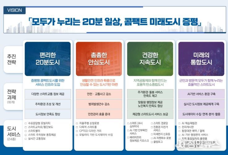 ‘모두가 누리는 20분 일상, 콤팩트 미래도시 증평’이라는 비전 아래 △편리한 20분도시 △촘촘한 안심도시 △건강한 지속도시 △미래의 활동도시 4가지 목표를 수립했다.