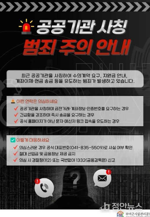 정안뉴스 황도연 기자 | 부여군시설관리공단은 최근 공공기관을 사칭해 물품 대리구매나 수의계약을 가장하고 선입금을 요구하는 사기 시도가 발생하고 있다며, 관내 업체와 협력사를 대상으로 각별한 주의를 당부했다.