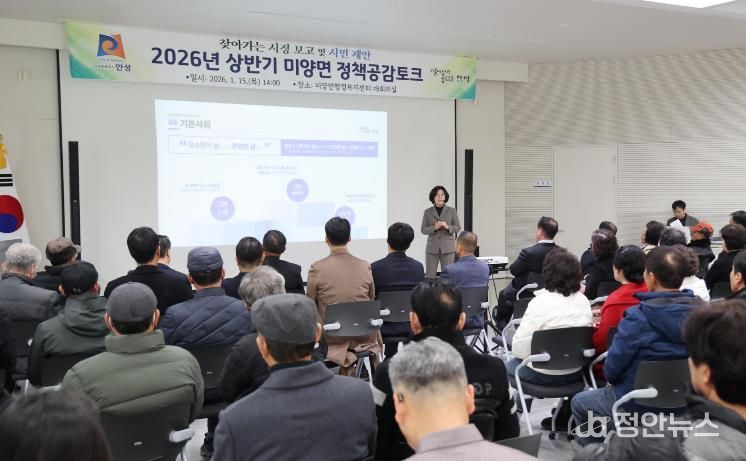 정안뉴스 안정주 기자 | 안성시 미양면은 지난 1월 15일, 미양면행정복지센터 대회의실에서 주민 120여 명이 참석한 가운데 ‘2026년 상반기 미양면 정책공감토크’를 성황리에 개최했다.