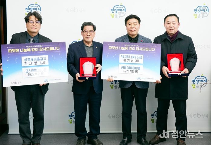 김재명 성북새마을금고 이사장과 황영선 현대자동차 성북삼선교점 대표는 “지역사회와 함께 성장해 온 기관으로서 나눔에 동참하게 되어 뜻깊게 생각한다” 며 “앞으로도 지역복지 발전을 위한 사회공헌 활동을 지속해 나가겠다”고 전했다.
