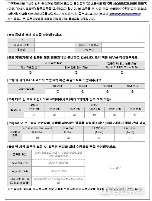 이번 활용 교육은 현장의 요청과 함께 우주청 개청 이후 지속해 온 '민간 역량 강화를 통한 위성산업 자립화'를 위한 기업 지원의 일환으로 기획되어 기업을 직접 방문하여 현장 맞춤형으로 실시한다. 교육대상 선정을 위한 수요조사는 1월 19일부터 31일까지 실시하여 기업에 소속된 핸드북 신청자에게 수요조사서를 송부하고 핸드북 전담 이메일로 접수를 받는다.