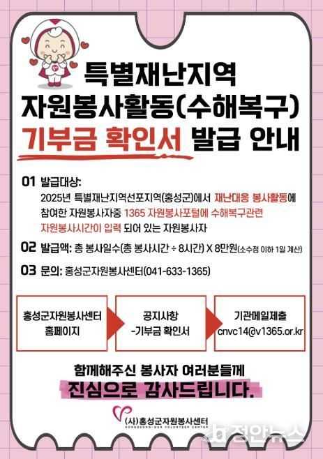 발급 대상은 2025년 홍성군 수해복구 자원봉사활동에 참여하고, 1365자원봉사포털에 수해복구 관련 봉사시간이 입력된 자원봉사자이며, 신청은 내달 13일까지이다.