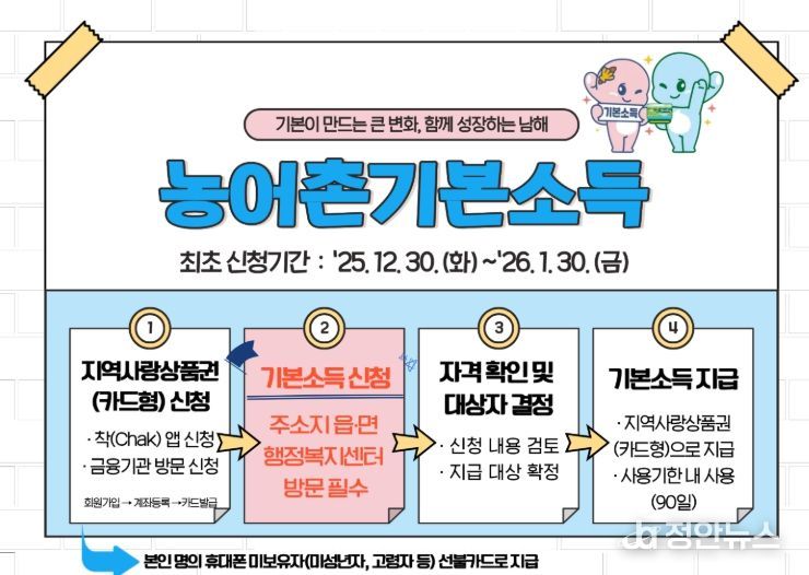 정안뉴스 김재홍 기자 | 남해군은 농어촌 기본소득 신청과 관련해 지역사랑상품권 ‘착(chak)카드’를 발급했더라도 기본소득 신청은 반드시 주소지 관할 읍·면 행정복지센터를 직접 방문해 접수해야 한다고 밝혔다.