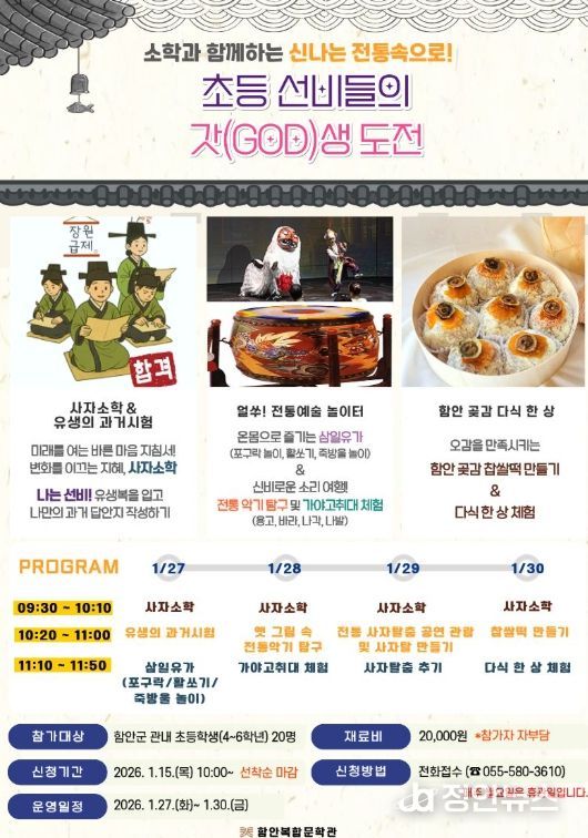 정안뉴스 김재홍 기자 | 함안군은 겨울방학을 맞아 오는 1월 27일부터 30일까지 함안복합문학관에서 관내 초등학생을 대상으로 ‘겨울방학 서당 프로그램-초등 선비들의 갓(GOD)생 도전’을 운영한다고 밝혔다.