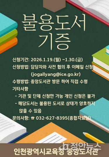 정안뉴스 안정주 기자 | 인천광역시교육청중앙도서관은 지역사회 내 도서 나눔 문화를 확산하고 지식 자원의 선순환을 실천하기 위해 ‘불용도서 기관 나눔’ 사업을 운영한다.
